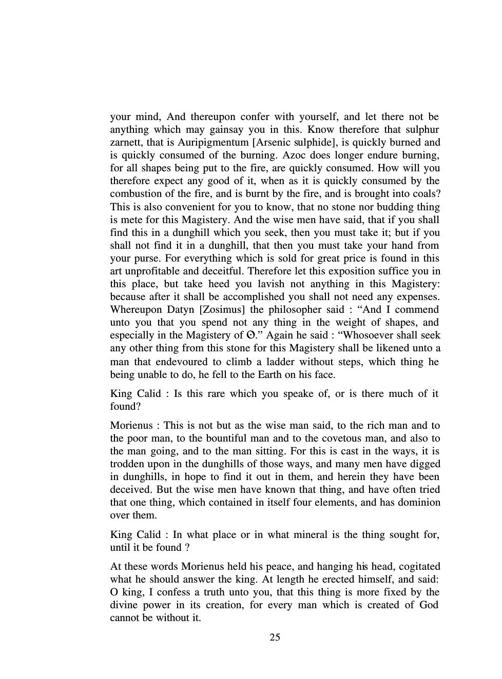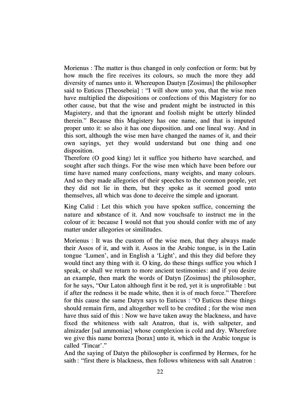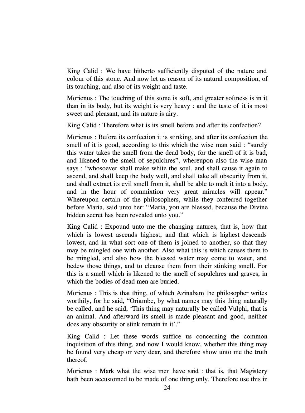 Morienus said: O good and prudent King, this is the exposition of kinds, which appertain to this Magistery, which our predecessors named by diverse and sundry names, that they which should seek for this Magistery unworthily, might all together err, contrary to the truth of it.