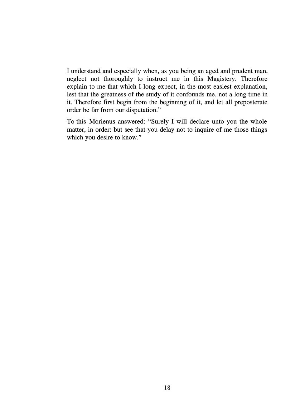 Morienus In the end of the book I will explain them: because now presently I will make the Magistery before you of those things of which these are the names, that those things which we have now spoken may be proved by the effects of the thing itself, For this is the root of this science, that he who will learn it, must first take the doctrine thereof of his Master, and afterwards let the master do it often times before his disciple.