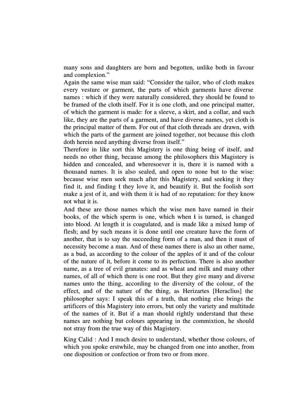 Then said the king: "Let us confer a little of the quality of that man and of his habit, for many years past there came a certain man unto me, who (to say the truth) effected this Magistery for me, and when he had finished it, he left me, the thing effected, but not the knowledge and science thereof, and secretly departed, and went his way."