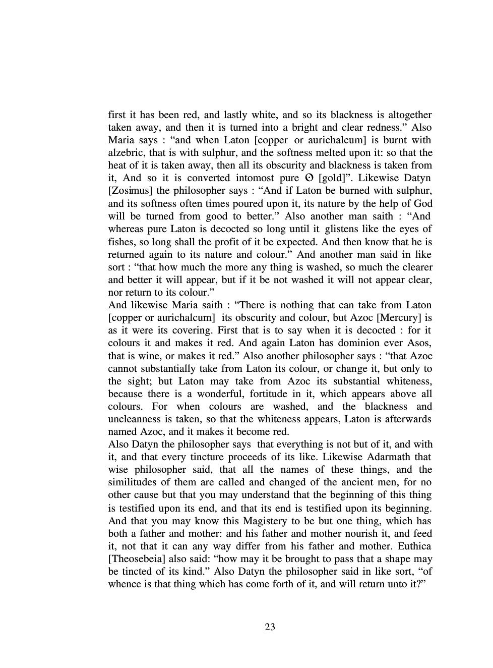 Therefore reveal unto no man these three kinds, nor their confection, but suffer the foolish and ignorant to seek all other things in this Magistery, and in seeking to err, because they shall not come to the effect of it, till ☉ Sol and ☽ Luna be brought into one body, which thing cannot happen without the express will and commandment of God.