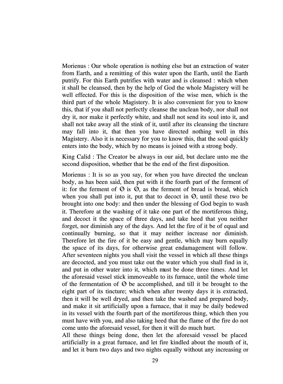 Morienus It is so as you say, for when you have directed the unclean body, as has been said, then put with it the fourth part of the ferment of it: for the ferment of ☉ Sol is ☉ Sol, as the ferment of bread is bread, which when you shall put into it, put that to decoct in ☉ Sol, until these two be brought into one body: and then under the blessing of God begin to wash it.