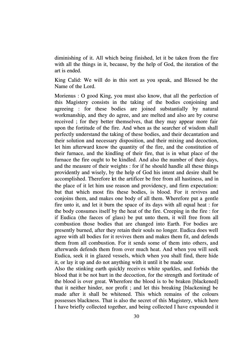 Morienus: O good King, you must also know, that all the perfection of this Magistery consists in the taking of the bodies conjoining and agreeing for these bodies are joined substantially by natural workmanship, and they do agree, and are melted and also are by course received; for they better themselves, that they may appear more fair upon the fortitude of the fire.