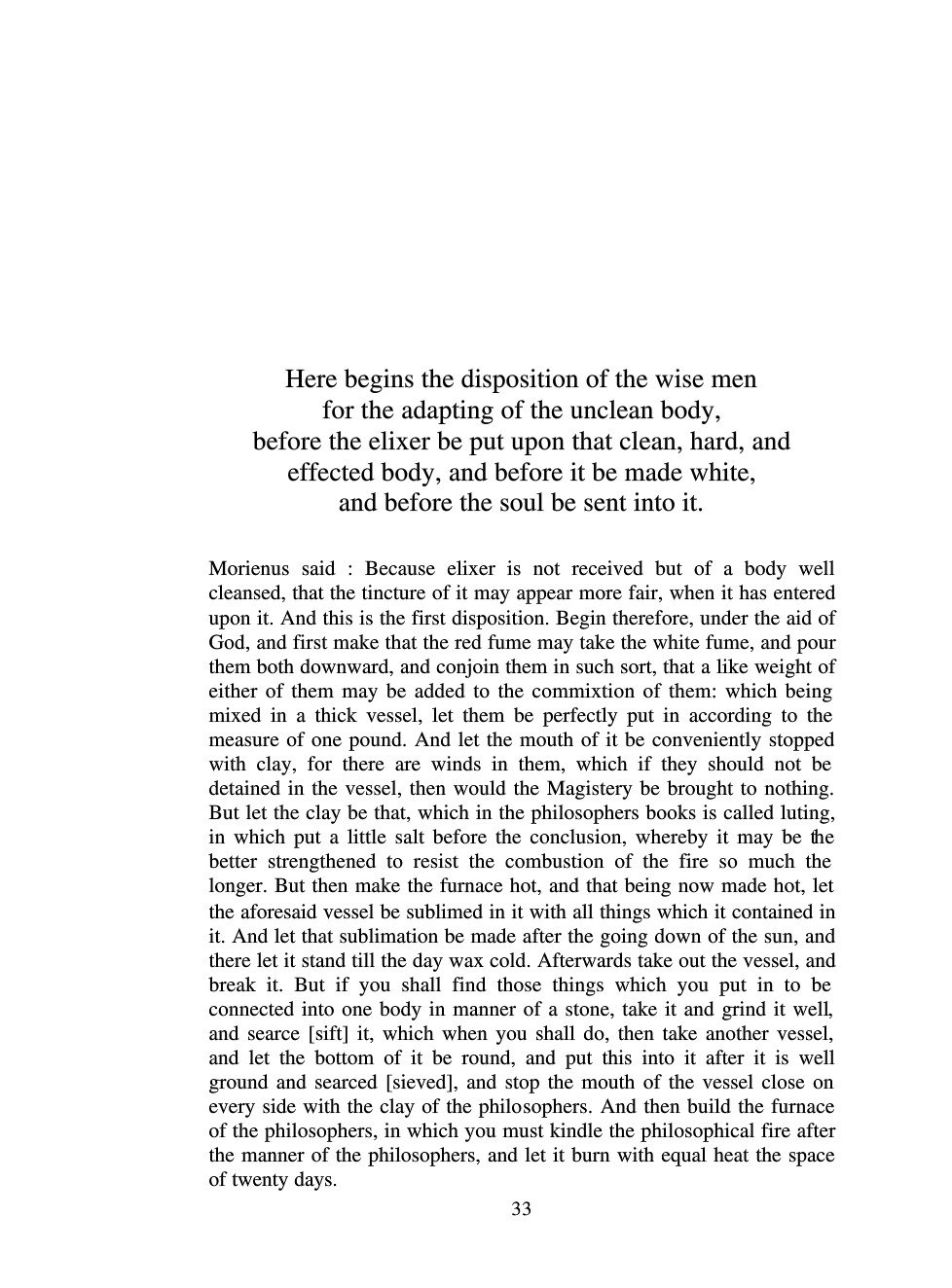 Here begins the disposition of the wise men for the adapting of the unclean body, before the elixer be put upon that clean, hard, and effected body, and before it be made white, and before the soul be sent into it.