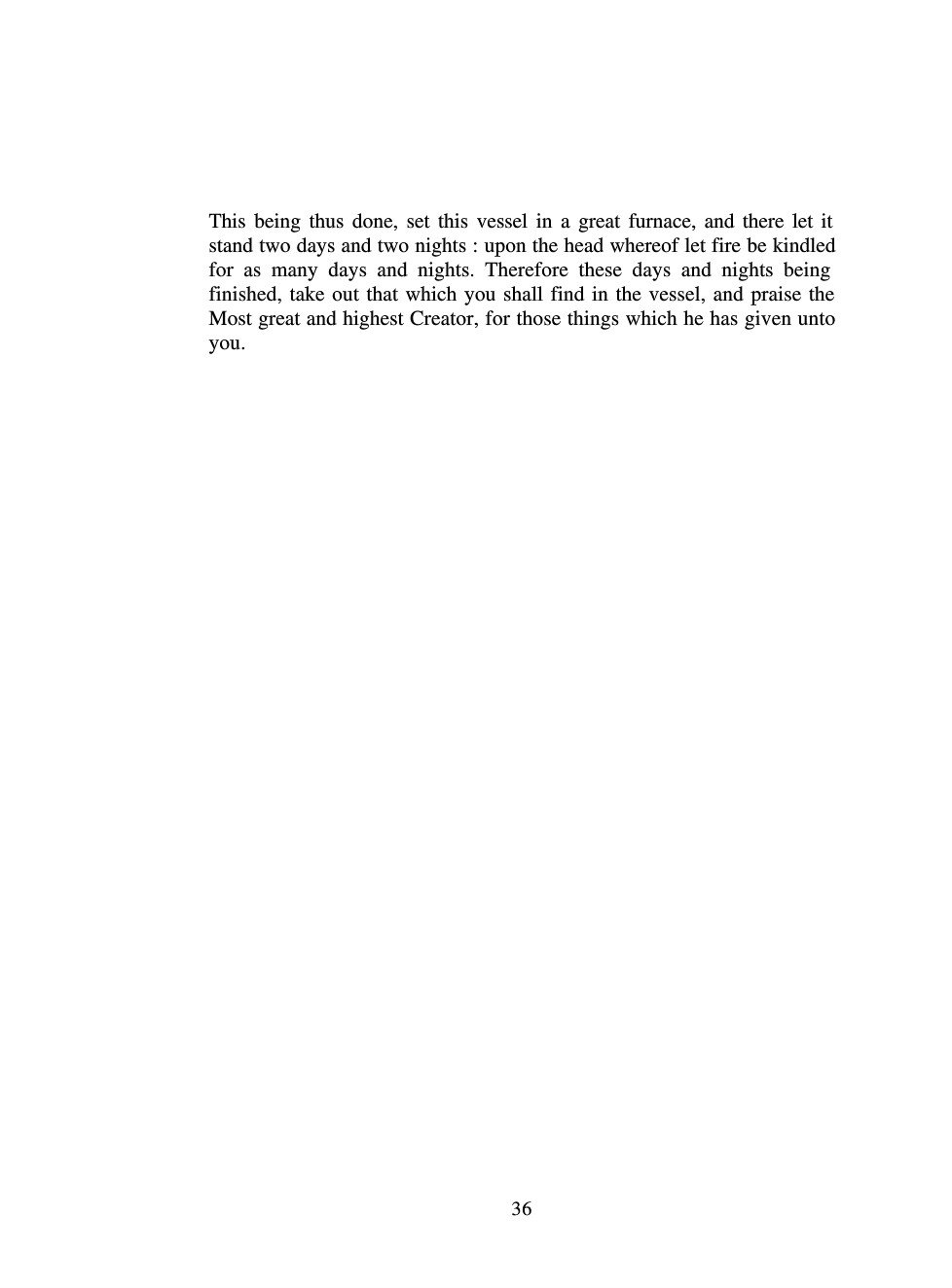 This being thus done, set this vessel in a great furnace, and there let it stand two days and two nights: upon the head whereof let fire be kindled for as many days and nights.