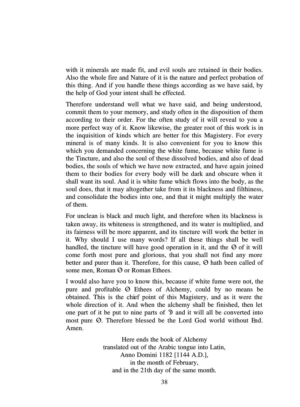 Here ends the book of Alchemy translated out of the Arabic tongue into Latin, Anno Domini 1182 [1144 A.D.].