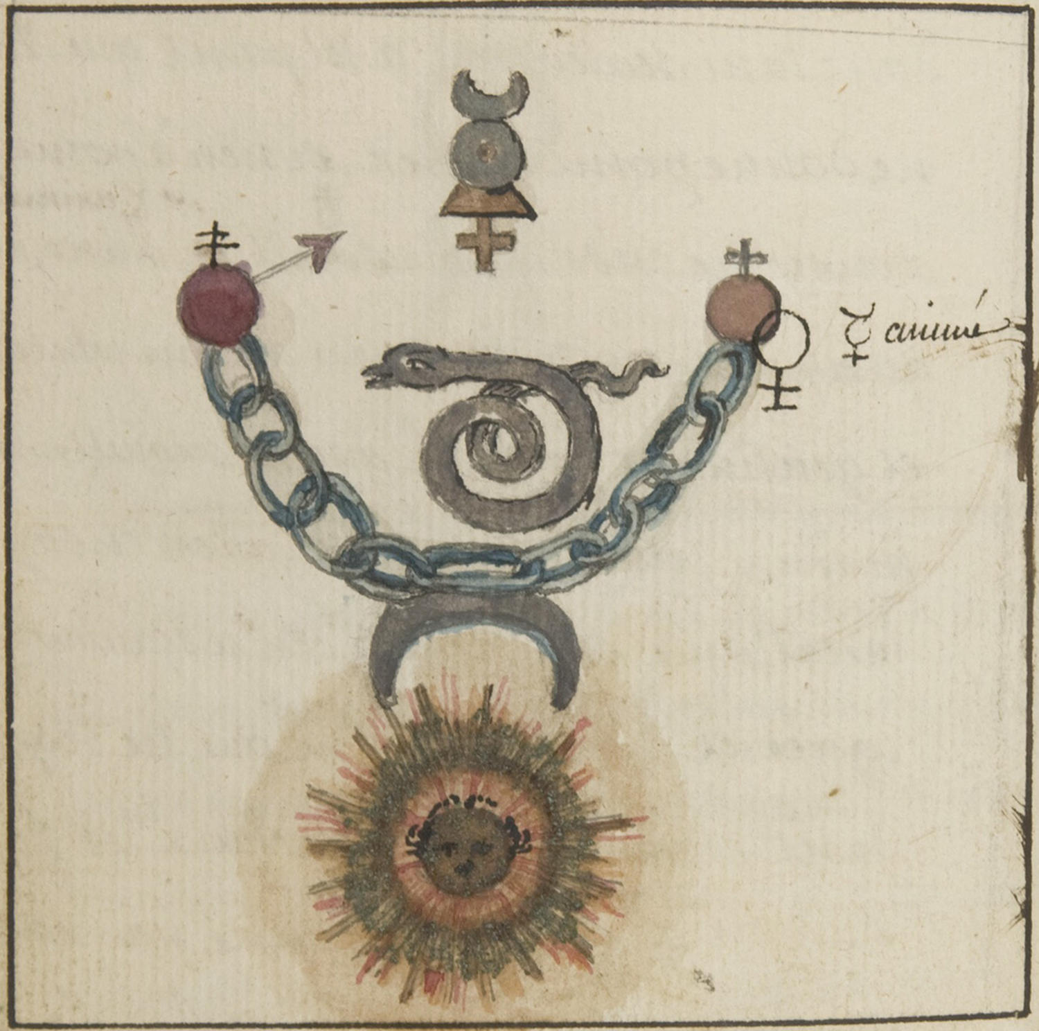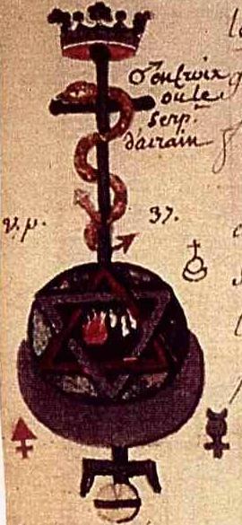 So is male and female and our hermaphrodite which is mercury and is this work in image in the seventh sheet and premium of the Jew Abraham which is namely two snakes around a golden rod, as you will see in it book that I made myself to my fancy as best as I could imagine it for you for clairvoyance and philosophical document.