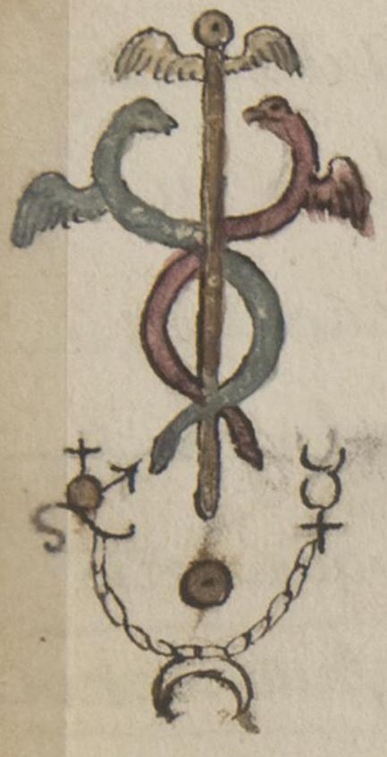 So is male and female and our hermaphrodite which is mercury and is this work in image in the seventh sheet and premium of the Jew Abraham which is namely two snakes around a golden rod, as you will see in it book that I made myself to my fancy as best as I could imagine it for you for clairvoyance and philosophical document.
