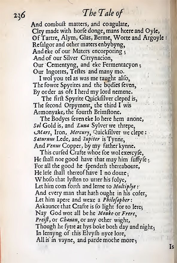 Geoffrey Chaucer (1340-1400) in his Canterbury Tales written between 1386-90, provided a portrait of the society of his times. Within this collection of stories, the Canon Yeoman's tale, gives us an insight into some of the ways in which alchemy was viewed at that time. Chaucer obviously had more than a superficial undertsanding of alchemy.