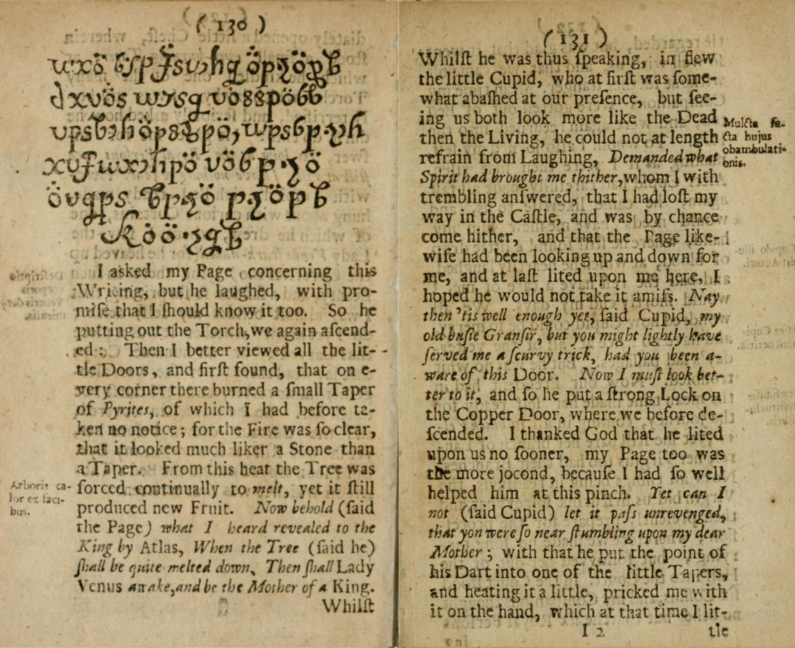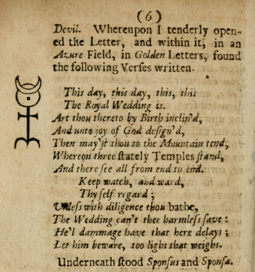 In so unlooked for an adventure I was at a loss, how either to advise, or assist my poor self, and therefore fell upon my knees and besought my Creator to permit nothing contrary to my eternal happiness to befall me; whereupon with fear and trembling, I went to the letter, which was now so heavy, as had it been mere gold, it could hardly have been so weighty. Now as I we. diligently viewing it, I found a little seal, whereupon a curious cross with this inscription, IN HOC SIGNO VINCES, was ingraven. Now as soon as I espied this sign I was the more comforted, as not being ignorant that such a seal was little acceptable, and much less useful, to the Devil. Whereupon I tenderly opened the letter, and within it, in an azure field, in golden letters, found the following verses written.