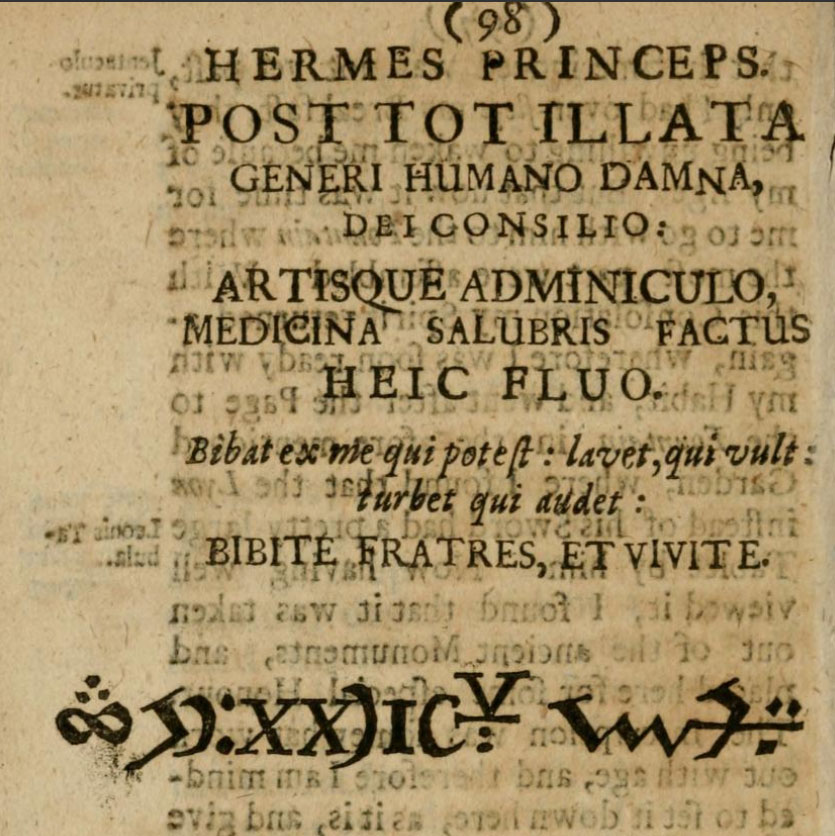 Upon this stood these letters, S. P. N. Besides this, a new pair of shoes were given me, for the floor of the castle was laid with pure shining marble; my old shoes I was to give away to one of the poor who sate in throngs, howbeit in very good order, under the gate. I then bestowed them on an old man; after which two pages with as many torches conducted me into a little room; there they willed me to sit down on a form, which I did, but they sticking their torches in two holes, made in the pavement, departed and thus left me sitting alone. Soon after I heard a noise, but saw nothing, and it proved to be certain men who stumbled in upon me; but since I could see nothing, I was fain to suffer, and attend what they would do with me; but presently perceiving them to be barbers, I intreated them not to jostle me so, for I was content to do whatever they desired, whereupon they quickly let me go, and so one of them (whom I could not yet see) fine and gently cut away the hair --- round about from the crown of my head, but on my forehead, ears and eyes he permitted my ice-grey locks to hang. In his first encounter (I must confess) I was ready to dispair, for inasmuch as some of them shoved me so forceably, and I could yet see nothing, I could think no other but that God for my curiosity had suffered me to miscarry. Now these invisible barbers carefully gathered up the hair which was cut off, and carried it away with them. After which the two pages entered again, and heartily laughed at me for being so terrified. But they had scarce spoken a few words with me, when again a little bell began to ring, which (as the pages informed me) was to give notice for assembling; whereupon they willed me to rise, and through many walks, doors and winding stairs lighted me into a spacious hall. In this room was a great multitude of guests, emperors, kings, princes, and lords, noble and ignoble, rich and poor, and all sorts of people, at which I hugely marvelled, and thought to my self, ah, how gross a fool hast thou been to engage upon this journey with so much bitterness and toil, when (behold) here are even those fellows whom thou well know'st, and yet hadst never any reason to esteem. They are now all here, and thou with all thy prayers and supplications art hardly got in at last. This and more the Devil at that time injected, whom I notwithstanding (as well as I could) directed to the issue. Mean time one or other of my acquaintance here and there spoke to me: Oh Brother Rosencreutz! Art thou here too; yea, (my brethren) replied I, the grace of God hath helped me in also; at which they raised a mighty laughter, looking upon it as ridiculous that there should be need of God in so slight an occasion. Now having demanded each of them concerning his way, and found that most were forced to clamber over the rocks, certain trumpets (none of which we yet saw) began to sound to the table, whereupon they all seated themselves, every one as he judged himself above the rest; so that for me and some other sorry fellows there was hardly a little nook left at the lower-most table. Presently the two pages entered, and one of them said grace in so handsom and excellent manner, as rejoyced the very heart in my body.