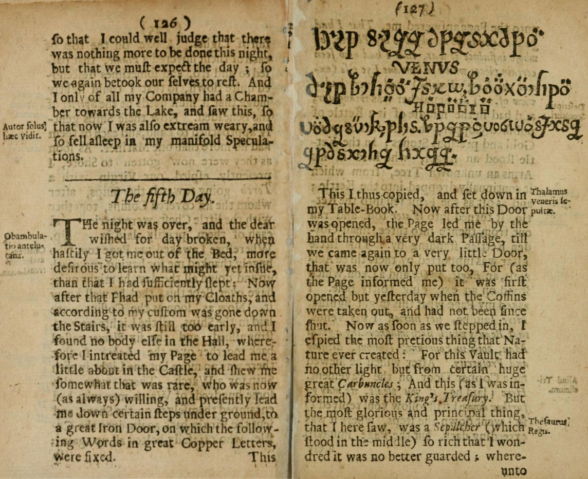 This was repeated upon each of them three times, after which all the lights were extinguished and carried away. The velvet carpets of the table were cast together over them, and immediately a travelling bed was unlocked and made ready, into which thus wrapped up they were born, and so after the carpets were taken off them, they were neatly laid by each other, where with the curtains drawn before them, they slept a good while. (Now was it also time for the Virgin to see how our other artists behaved themselves. They were well pleased because, as the Virgin afterwards informed me, they were to work in gold, which is indeed a piece of this art, but not the most principal, most necessary and best. They had indeed too a part of these ashes, so that they imagined no other but that the whole bird was provided for the sake of gold, and that life must thereby be restored to the deceased.) Mean time we sat very still, attending when our married couple would awake. Thus about half an hour was spent. For then the wanton Cupid presented himself again, and after he had saluted us all, flew to them behind the curtain, tormenting them so long till they awaked. This happened to them with very great amazement, for they imagined no other but that they had hitherto slept from the very hour in which they were beheaded. Cupid, after he had awaked them, and renewed their acquaintance one with another, stepped aside a little, and permitted them both somewhat better to recruit themselves, mean time playing his tricks with us, and at length he would needs have the music fetched to be somewhat the merrier. Not long after the Virgin herself comes, and after she had most humbly saluted the young King and Queen (who found themselves somewhat faint) and kissed their hands, she brought them the two forementioned curious garments, which they put on, and so stepped forth. Now there were already prepared two very curious chairs, wherein they placed themselves, and so were by us with most profound reverence congratulated, for which the King in his own person most graciously returned his thanks, and again re-assured us of all grace. It was already about five of clock, wherefore they could make no longer stay, but as noon as ever the chiefest of their furniture could be laden, we were to attend the young Royal Persons down the winding stairs, through all doors and watches unto the ship, in which they embarked themselves, together with certain virgins and Cupid, and sailed so mighty swift that we soon lost sight of them, yet they were met (as I was informed) by certain stately ships. Thus in four hours time they had made many leagues out at sea. After five of clock the musicians were charged to carry all things back again to the ships, and to make themselves ready for the voyage. But because this was somewhat long a doing, the old lord commanded forth a party of his concealed soldiers, who had hitherto been planted in the wall, so that we had taken no notice of any of them, whereby I observed that this Tower was well provided against opposition. Now these soldiers made quick work with our stuff that no more remained further to be done but to go to supper. Now the table being completely furnished, the Virgin brings us again to our companions where we were to carry our selves as if we had truly been in a lamentable condition and forbear Laughing. But they were always smiling one upon another, howbeit some of them too sympathised with us. At this supper the old lord was with us too, who was a most sharp inspector over us, for none could propound any thing so discreetly, but that he knew how either to confute it, or amend it, or at least to give some good document upon it. I learned most by this lord, and it were very good that each one would apply himself to him, and take notice of his procedure, for then things would not so often and so untowardly miscarry. After we had taken our nocturnal reflection, the old lord led us into his closets of rarities, which were here and there dispersed amongst the bulwarks where we saw such wonderful productions of Nature, and other things too which man's wit in imitation of Nature had invented, that we needed a year more sufficiently to survey them. Thus we spent a good part of the night by candlelight. At last, because we were more inclined to sleep than see many rarities we were lodged in rooms in the wall, where we had not only costly good beds but also besides extraordinary handsome chambers, which made us the more wonder why we were the day before forced to undergo so many hardships. In this chamber I had good rest, and being for the most part without care, and weary with continual labour, the gentle rushing of the sea helped me to a sound and sweet sleep, for I continued in one dream from eleven of clock till eight in the morning.