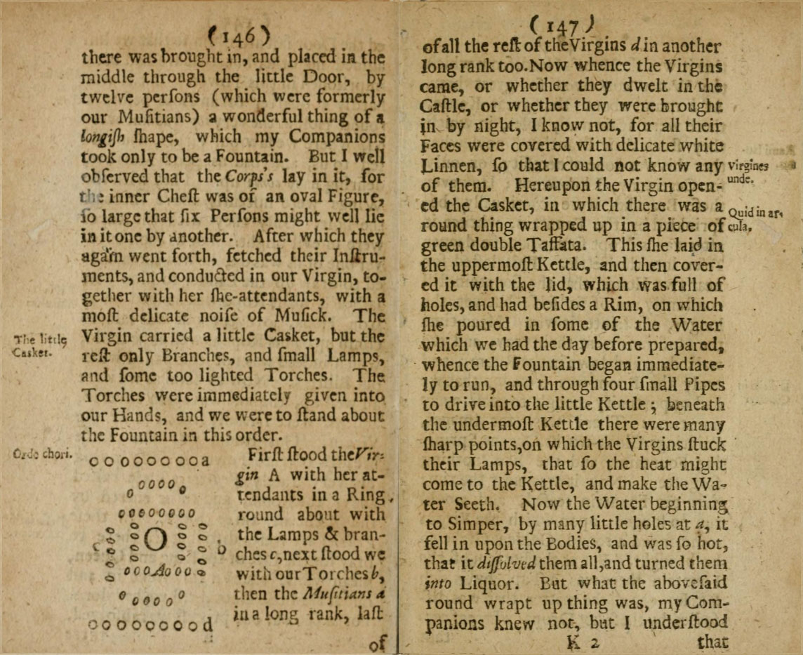 First stood the Virgin A with her attendants in a ring round about with the lamps and branches c. Next stood we with our torches b, then the musicians a in a long rank; last of all the rest of the virgins d in another long rank too. Now whence the virgins came, or whether they dwelt in the castle, or whether they were brought in by night, I know not, for all their faces were covered with delicate white linen, so that I could not know any of them. Hereupon the Virgin opened the casket, in which there was a round thing wrapped up in a piece green double taffeta. This she laid in the uppermost kettle, and then covered it with the lid, which was full of holes, and had besides a rim, on which she poured in some of the water which we had the day before prepared, whence the fountain began immediately to run, and through four small pipes to drive into the little kettle. Beneath the undermost kettle there were many sharp points, on which the virgins stuck their lamps, that so the heat might came to the kettle, and make the water seethe. Now the water beginning to simmer, by many little holes at a, it fell in upon the bodies, and was so hot, that it dissolved them all, and turned them into liquor. But what the above said round wrapped up thing was, my companions knew not, but I understood that it was the Moor's head, from which the water conceived so great heat. At b round about the great kettle, there were again many holes, in which they stuck their branches. Now whether this was done of necessity, or only for ceremony, I know not. However, these branches were continually besprinkled by the fountain, whence it afterwards drops somewhat of a deeper yellow into the kettle. This lasted for near two hours, that the fountain still constantly ran of it self; but yet the longer, the fainter it was.