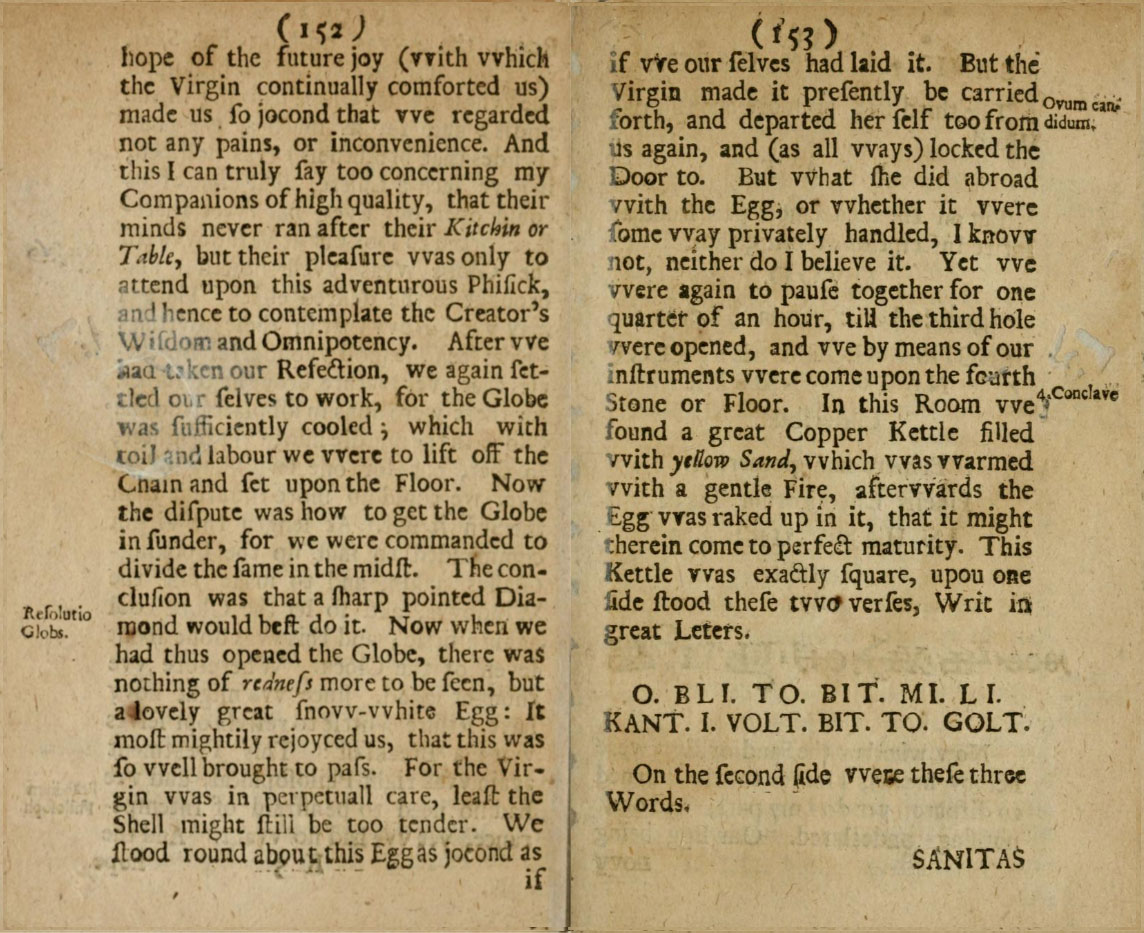 After we had taken our refection, we again settled ourselves to work, for the globe was sufficiently cooled, which with toil and labour we were to lift off the chain and set upon the floor. Now the dispute was how to get the globe in sunder, for we were commanded to divide the same in the midst. The conclusion was that a sharp pointed diamond would best do it. Now when we had thus opened the globe, there was nothing of redness more to be seen, but a lovely great snow-white egg. It most mightily rejoiced us, that this was so well brought to pass. For the Virgin was in perpetual care, least the shell might still be too tender. We stood round about this egg as jocund as if we ourselves had laid it. But the Virgin made it presently be carried forth, and departed herself too from us again, and (as all ways) locked the door to. But what she did abroad with the egg, or whether it were some way privately handled, I know not, neither do I believe it. Yet we were again to pause together for one quarter of an hour, till the third hole were opened, and we by means of our instruments were come upon the fourth stone or floor. In this room we found a great copper kettle filled with yellow sand, which was warmed with a gentle fire. Afterwards the egg was raked up in it, that it might therein come to perfect maturity. This kettle was exactly square; upon one side stood these two verses, writ in great letters: