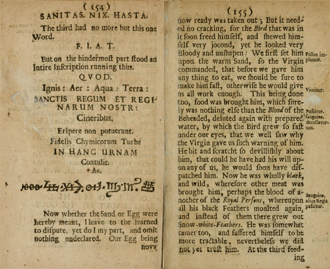 Now whether the sand or egg were hereby meant, I leave to the learned to dispute, yet do I my part, and omit nothing undeclared. Our egg being now ready was taken out, but it needed no cracking, for the bird that was in it soon freed himself, and showed himself very jocund, yet he looked very bloody and unshapen. We first set him upon the warm sand, so the Virgin commanded that before we gave him any thing to eat, we should be sure to make him fast, otherwise he would give us all work enough. This being done too, food was brought him, which surely was nothing else than the blood of the beheaded, diluted again with prepared water, by which the bird grew so fast under our eyes, that we well saw why the Virgin gave us such warning of him. He bit and scratched so devilishly about him, that could he have had his will upon any of us, he would soon have dispatched him. Now he was wholly black, and wild, wherefore other meat was brought him, perhaps the blood of another of the Royal Persons, whereupon all his black feathers moulted again, and instead of them there grew out snow-white feathers. He was somewhat tamer too, and suffered himself to be more tractable. Nevertheless we did not yet trust him. At the third feeding his feathers began to be so curiously coloured, that in all my life I never saw the like colours for beauty. He was also exceeding tame, and behaved himself so friendly with us, that (the Virgin consenting) we released him from his captivity. "Tis now reason," began our Virgin, "since by your diligence, and our old man's consent, the bird has attained both his life, and the highest perfection, that he be also joyfully consecrated by us."