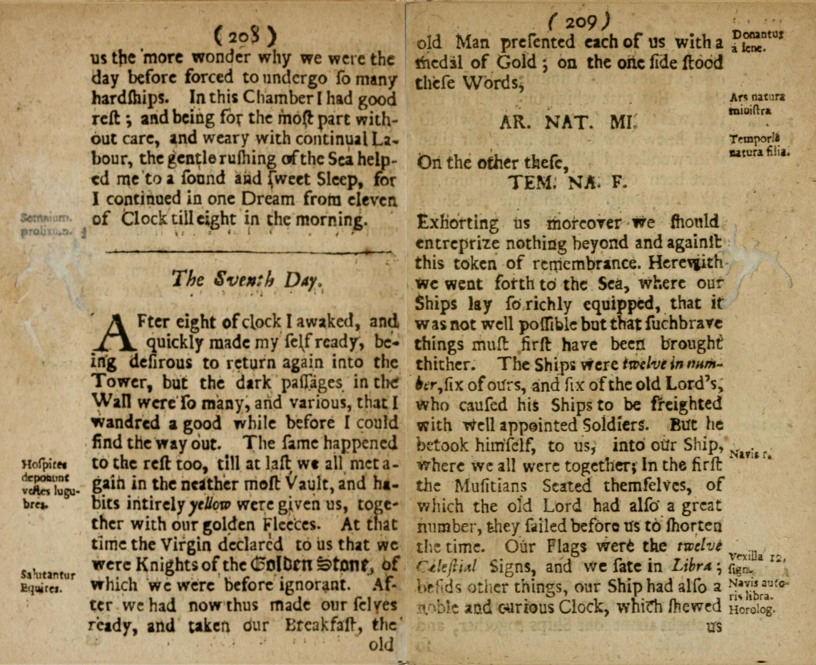 After eight of clock I awaked, and quickly made myself ready, being desirous to return again into the Tower, but the dark passages in the wall were so many and various, that I wandred a good while before I could find the way out. The same happened to the rest too, till at last we all met again in the neither most vault, and habits entirely yellow were given us, together with our golden fleeces. At that time the Virgin declared to us that we were Knights of the Golden Stone, of which we were before ignorant. After we had now thus made ourselves ready, and taken our breakfast, the old man presented each of us with a medal of gold; on the one side stood these words,