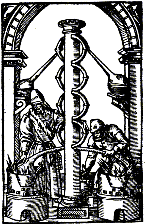 By which it extinguishes inconvenient things, superfluous humors, and dampens natural heat, so much so that no thing has ever been found by the greatest philosophers more suitable for the sustenance of life, although this quintessence sometimes has the complexion of the thing which is added to it, because it draws the complexion of every complexed thing, to which it is added, however if it is alone of itself, it has in it totally no complexion of the four qualities, not of the air also Know quarterly, & for the last, that such quintessence also has nothing of the earthly element, cold or dry, because it cures melancholic illnesses, which are cold. To conclude, then, you see it being neither hot nor cold, dry nor humid, for what it is of a temperate nature, exceeding all the elements which act under the sky: for when it is administered to someone, it makes that temperate body does not escape from its temperance, taking on qualities or complexions, and also does not escape until it is medicine for the cold; diseases, because it is of a warm nature, and also because it cures lime diseases, because it is of a cold nature, because two opposites cannot be in a body, because one is the opposite of the another is expelled and expelled by him. And yet we see that it must not be called hot or cold, neither dry nor humid, from which thing it cures consumption, which is wet and cold. But all these four qualities are in them corrupted and totally removed, and although it is not an element, it is nevertheless a thing tempered by these elements purified, and extracted from the filth and dregs of the four elements, which are the very cause of corruption. These sludge & lees are therefore separated, like large bodies, but very large freed from their matter, like from the very subtle soul, by the art & science of distillations. And nevertheless, let quintessence be a common word, of all things which have form and species, to draw it from that thing, and also let this be understood, even of wine, however several other matters are, from which that quintessence can be drawn, like all metals, all fruits, flesh of eggs, roots, herbs, & other things, like juices & broths, as we teach: however the fifth being excels all other things, for its very great subtlety, & yet has it been called by several philosophers, the philosophical sky. For what reason has the sky with the four elements, such has this sky of philosophers, which we call the quintessence, with the four qualities of the human body, which is composed of these elements. It is also called by some fiery water, because it is burned with fire, when it is carried out to perfection and extreme distillation, leaving no superfluous humidity, in this vessel, as we show the way of knowing it, by some others is called the soul of wine, because just as this soul is nobler than its body, so too is the quintessence, which is drawn & extracted by true distillation, more noble than the wine from which it is drawn. Others call it water of life, because it preserves human life from corruption as we see in those who have fainting and heart failure. And because it is variably drawn we will speak first of the first way of extracting the water of life into distillate, being depicted here the shape of the oven.