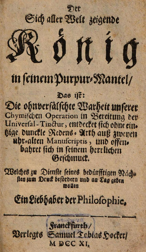 Der Sich aller Welt zeigende König in seinem Purpur-Mantel, Das ist: Die ohnverfälschte Warheit unserer Chymischen Operation in Bereitung der Universal-Tinctur, entdecket sich ohne eintzige dunckle Redens-Arth auß zweyen uhr-alten Manuscriptis, und offenbahret sich in seinem herrlichen Geschmuck: Welches zu Dienste seines bedürfftigen Nächsten zum Druck befördern und an Tag geben wollen