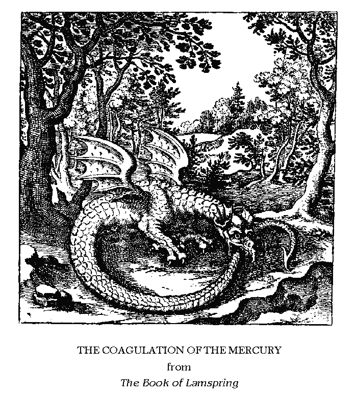 Compare this with the description given by Thomas Vaughan in his Cælum Term, where he says: "Divide the essences thereof, not by violence, but by natural putrefaction, such as may occasion a genuine dissolution of the compound. Here thou shalt find a miraculous White Water, an influence of the Moon, which is the mother of our chaos. It rules in two elements—earth and water. After this appears the sperm or influx of the Sun, which is the father of it. If is a quick, celestial fire, incorporated in a thin, oleous, aerial moisture. It is incombustible, for it is a fire itself and feeds upon fire; and the longer it stays in the fire the more glorious it grows. These are the two mineral sperms—masculine and feminine. If thou dost place them both on their crystalline basis, thou hast the philosopher's flying Fire-Drake, which at first sight of the sun breathes such a poison that nothing can stand before him."