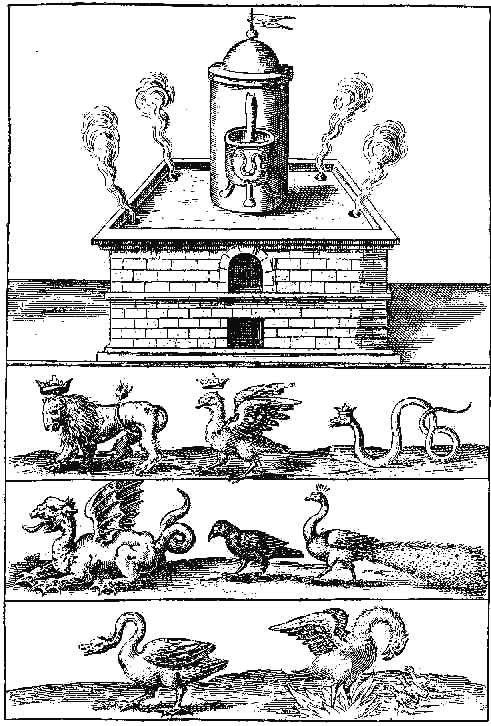 Not less plain is Jean de Meung, who tells us that after putrefaction succeeds generation, and that because of the inward, incombustible Sulphur that heats or thickens the coldness and crudities of the Quicksilver, which suffers so much thereby that at last it is united to the Sulphur and made one body therewith. All this—namely the fire, air and water—is contained in one vessel. In their earthly vessel—that is, in their gross body or composition—I take them, he says, and then I leave them in one alembic, where I concoct, dissolve and sublime them without the help of hammer, tongs or file ; without coals, smoke, fire or bath; or the alembics of the sophisters. For I have my heavenly fire, which excites or stirs up the elemental one, according as the matter desires a becoming agreeable form.