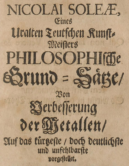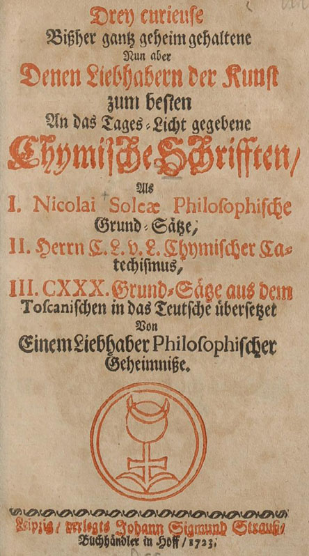 Drey curieuse Bißher gantz geheim gehaltene Nun aber Denen Liebhabern der Kunst zum besten An das Tages-Licht gegebene Chymische Schrifften : Als I. Nicolai Soleae Philosophische Grund-Sätze, II. Herrn C. L. V. L. Chymischer Catechismus, III. CXXX. Grund-Sätze aus dem Toscanischen in das Teutsche übersetzet / Von Einem Liebhaber Philosophischer Geheimniße
