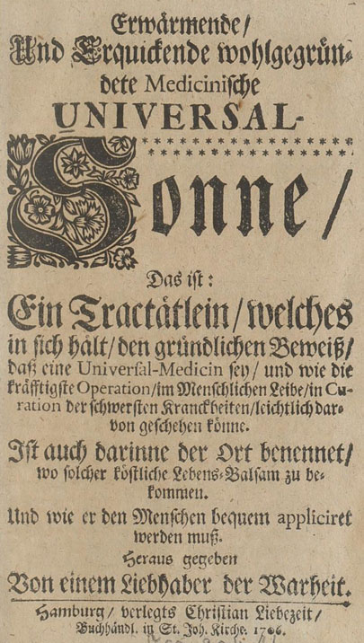 Erwärmende, und erquickende wohlgegründete medicinische Universal-Sonne Das ist: ein Tractätlein, welches in sich hält, den gründlichen Beweiß, daß eine Universal-Medicin sey ... / Heraus gegeben von einem Liebhaber der Warheit
