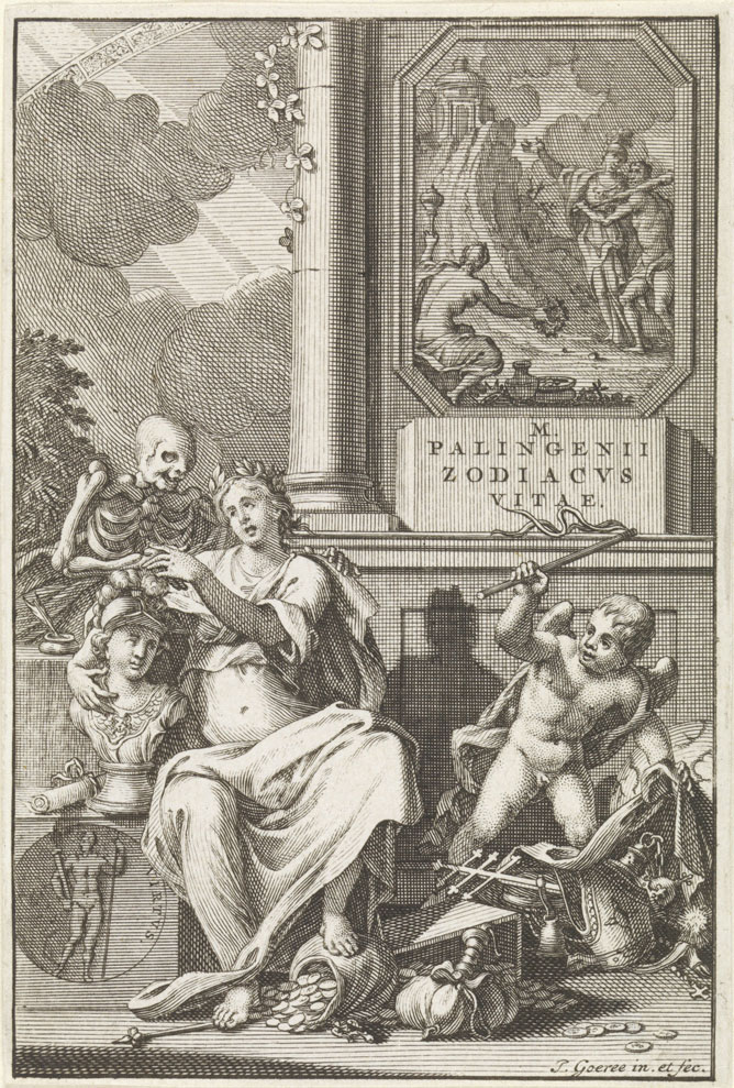 A woman with a laurel crown sits on a bench next to the statue bust of Minerva. She holds the hand of Death. At her feet are worldly riches. On the right, a putto with a whip reveals symbols of the church, hidden under a blanket. Behind the putto a wall with the title of the book and a wall painting of Hercules at the crossroads. In the background in the sky part of the zodiac